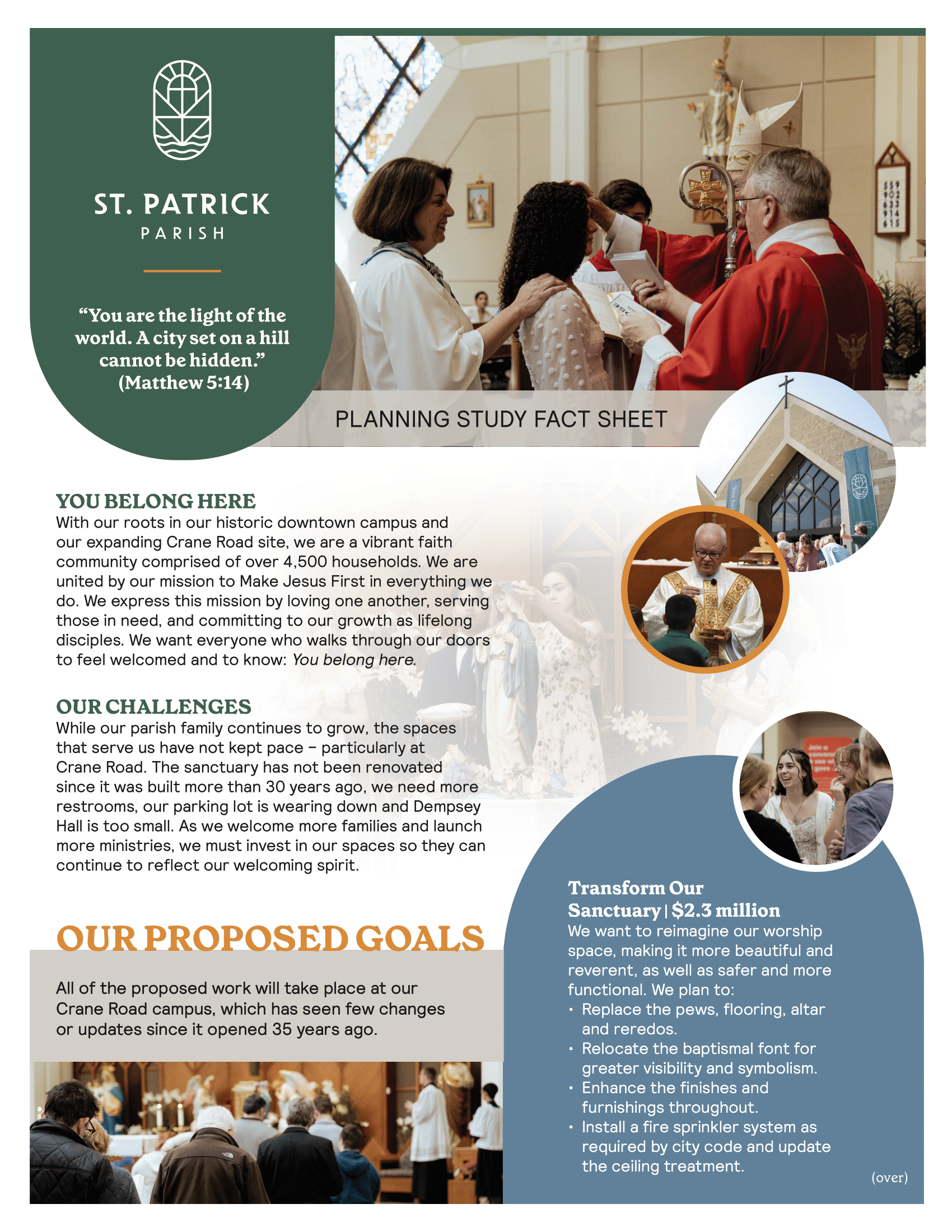Our parish is growing—and with it, our need to create spaces that reflect the beauty, warmth, and vitality of our faith community. Through our Capital Campaign, we are renewing our Crane Road campus: transforming our sanctuary, expanding hospitality areas, and ensuring our facilities serve generations to come. Your gift directly supports this vision. Together, we can build a parish home that welcomes all and proclaims the light of Christ to our community.